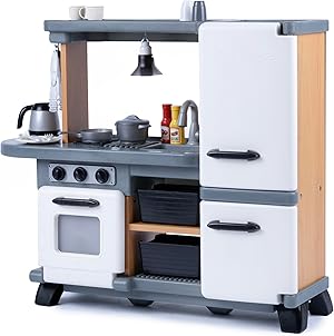 Indoor kitchenette with interactive lights and sounds. Durable plastic play kitchen with 25-piece accessory set. For toddlers 2+ years old.