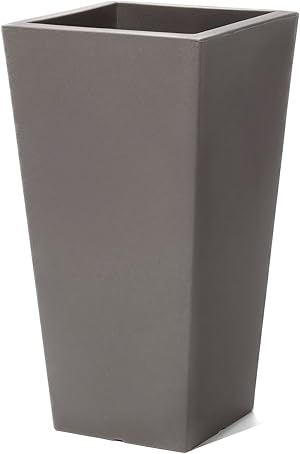 Tall tapered square planter, 28 inches. Indoor/outdoor lightweight plastic planter with drainage.