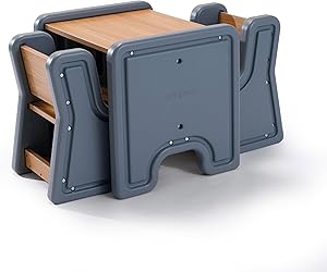 Playroom activity table for arts and crafts with two chairs. Durable plastic in Sage Gray. For toddlers 2+ years old.